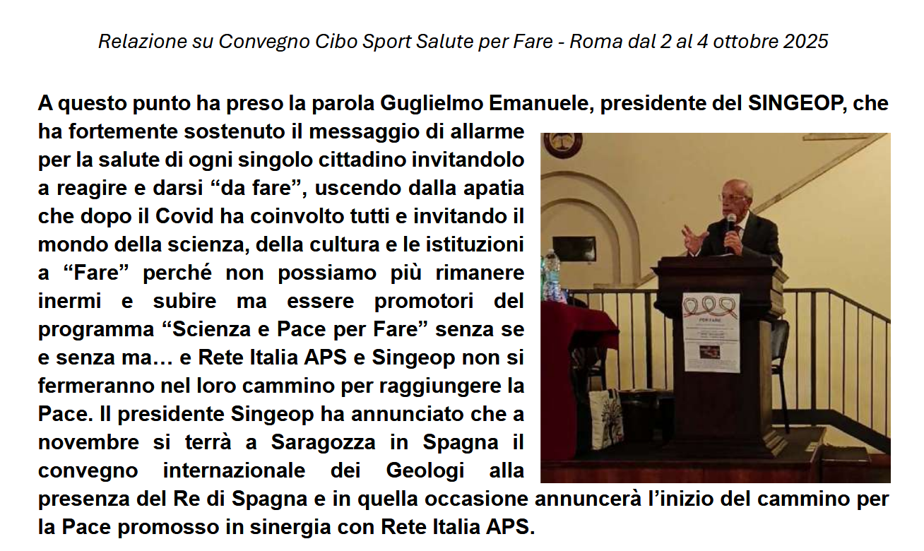 Un cammino volto al sostegno anche, del progetto promosso da Rete Italia APS congiuntamente al Sindacato nazionale dei Geologi Professionisti, il SINGEOP, denominato “Scienza e Pace per Fare” che è stato presentato durante la prima giornata dei convegni romani dal presidente del SINGEOP, Guglielmo Emanuele.